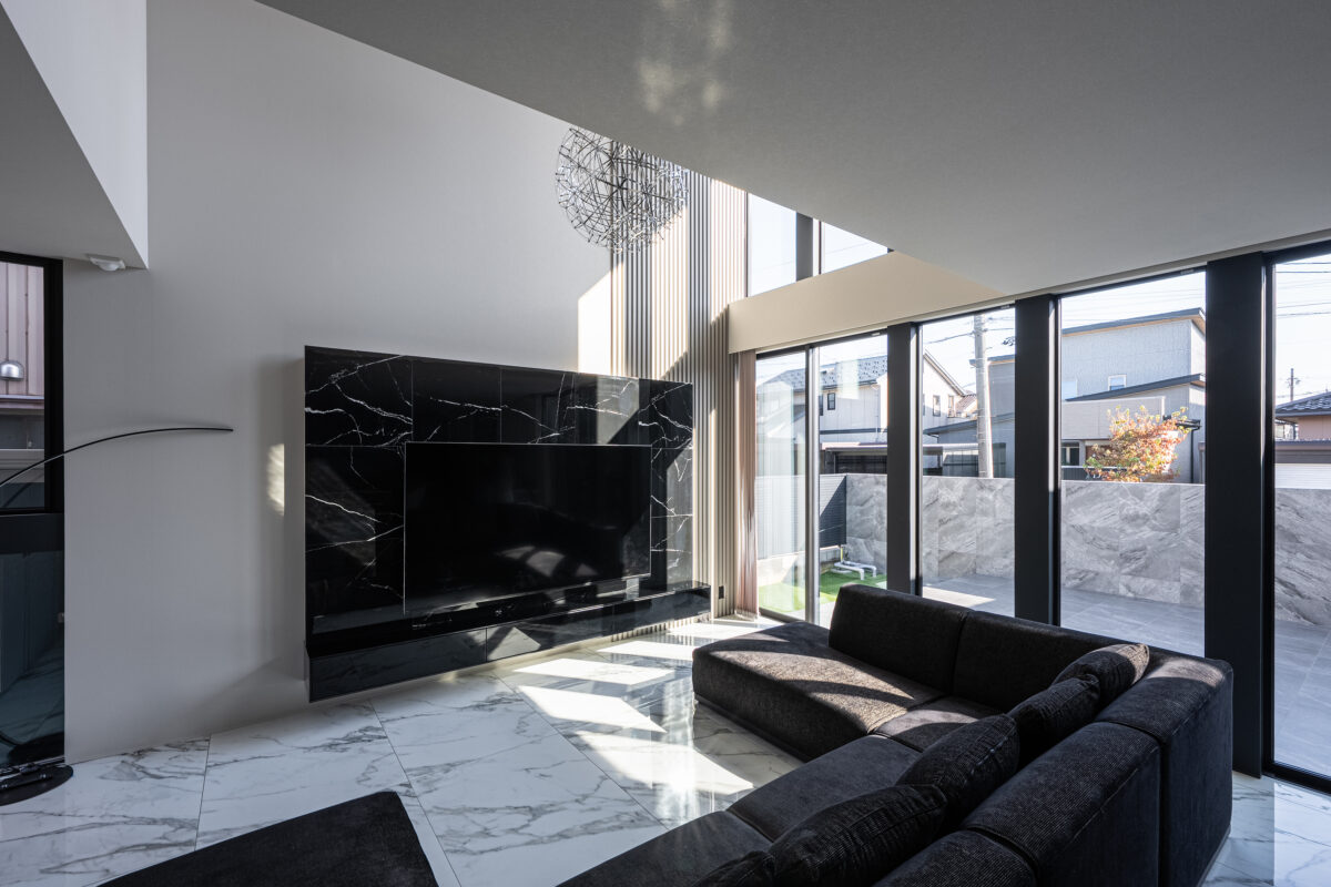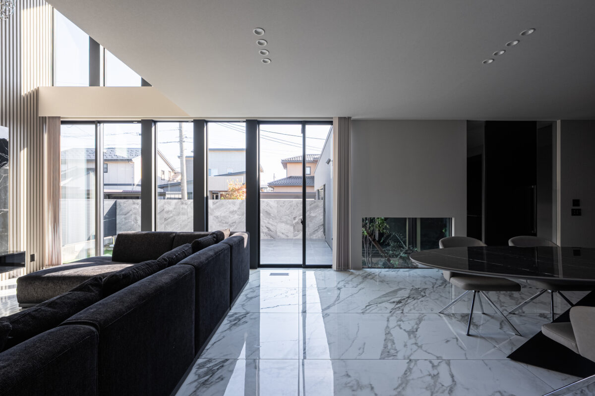 LDKの床には大判マーブル調タイルを採用し、全館空調で一年中快適。
