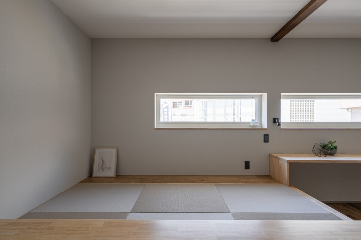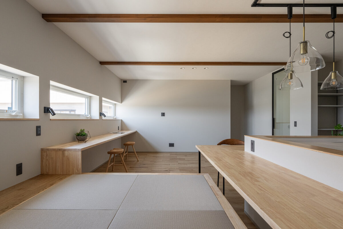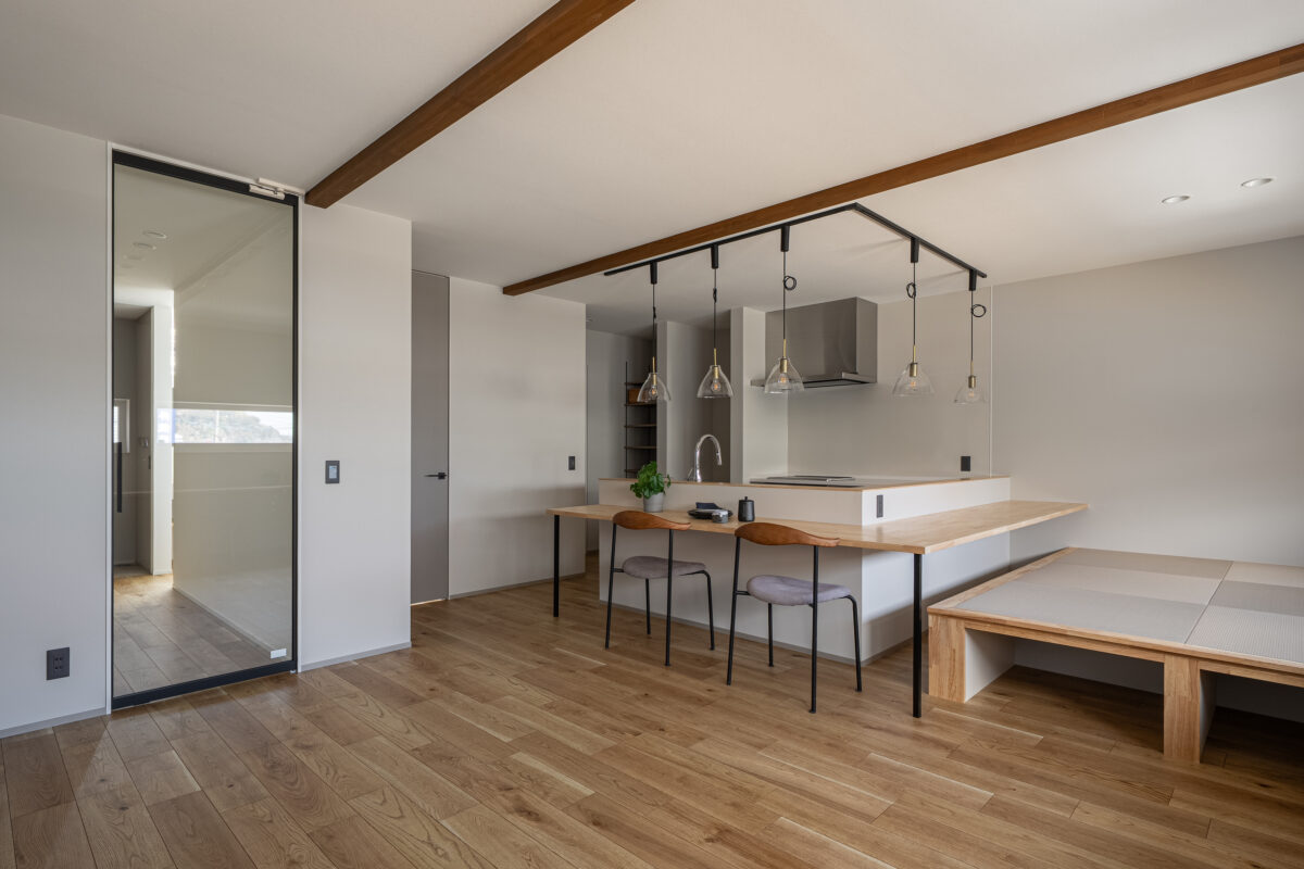 小上がりの畳スペースに腰掛ければ、キッチンと一体型のカウンターで