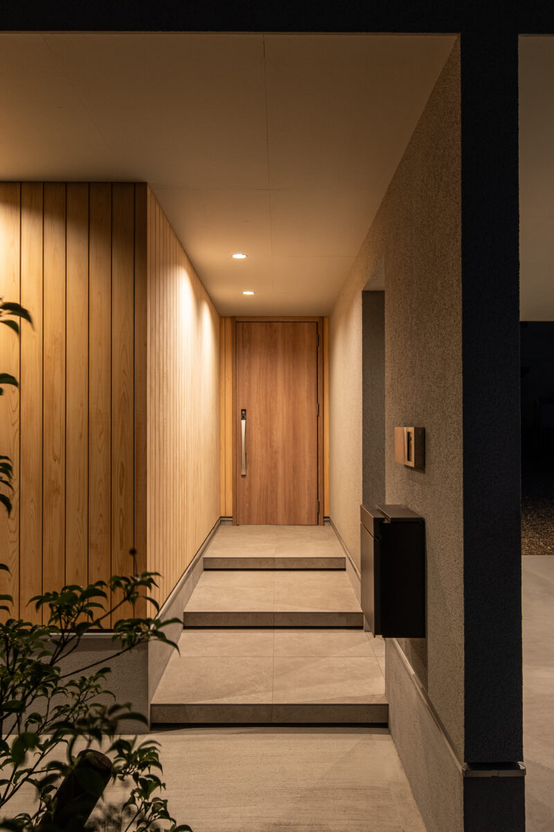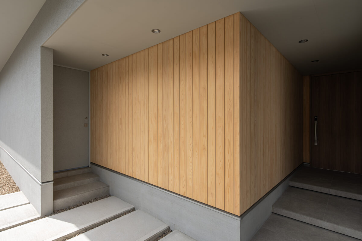 玄関や水回りは天井高を少し下げ、あえて閉鎖的な印象をつくりだし