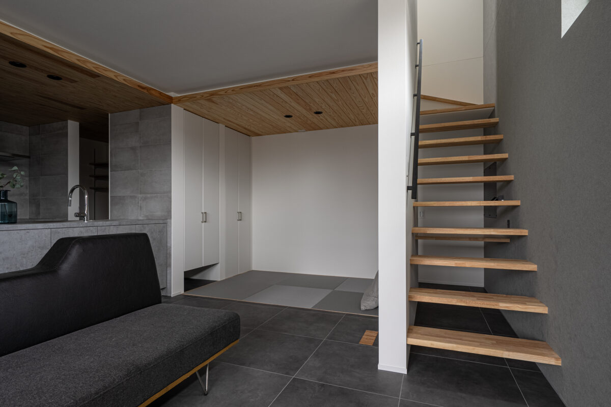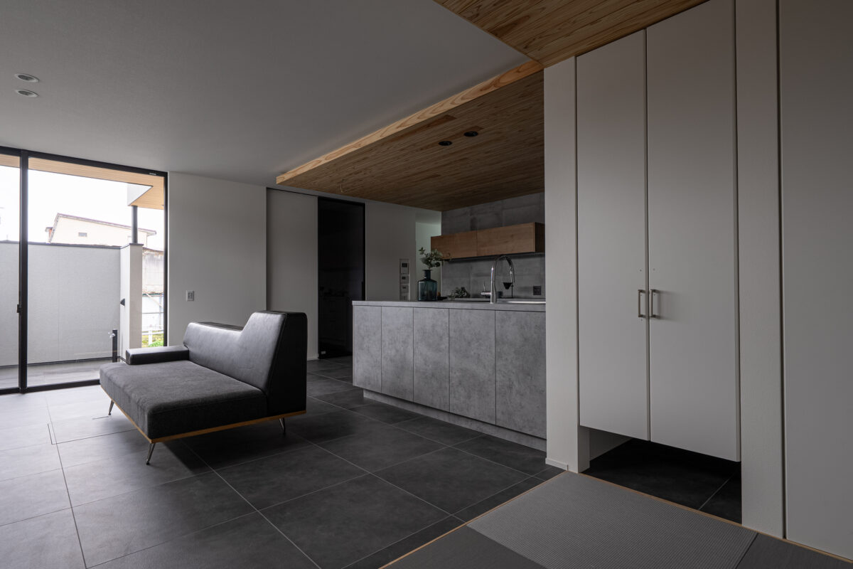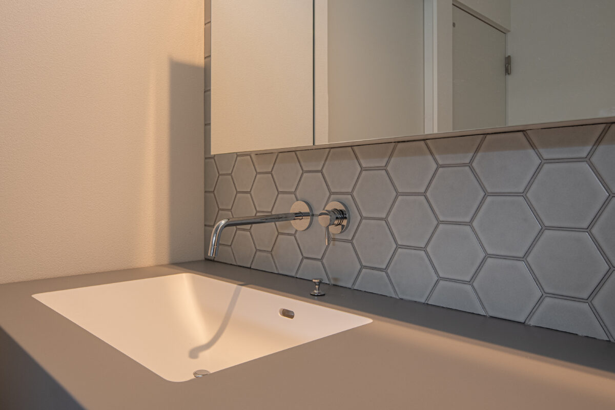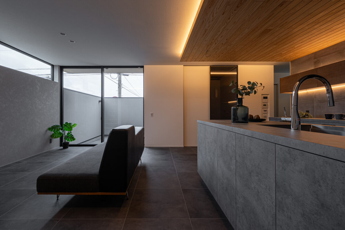 無垢材ではなく、グレー基調のタイルと壁材が都会的な洗練さを醸し出し、どこか静謐な美術館のような印象です。
