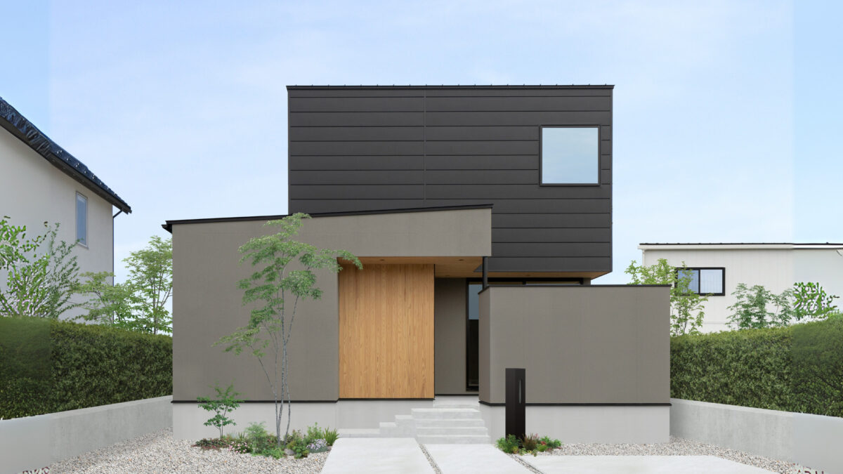 ジョリパットの優しい質感、杉の羽目板が添えるナチュラルテイスト、そして金属サイディングのシャープな輪郭。